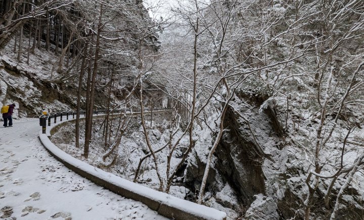 道中は渓谷沿いの岩場や橋がカチカチに凍結しているところもあり、軽アイゼンやチェーンスパイクは絶対に欠かせません。