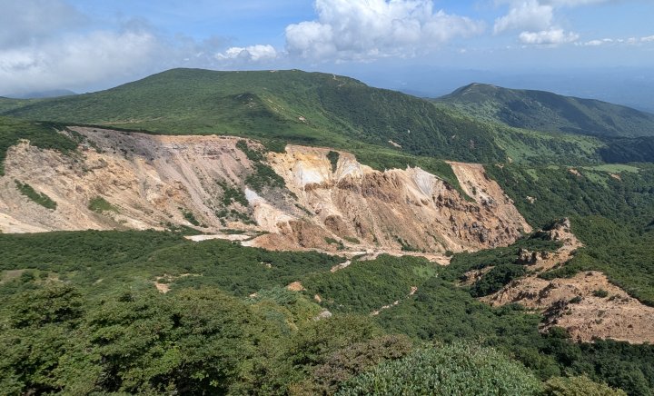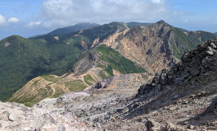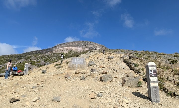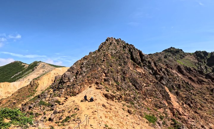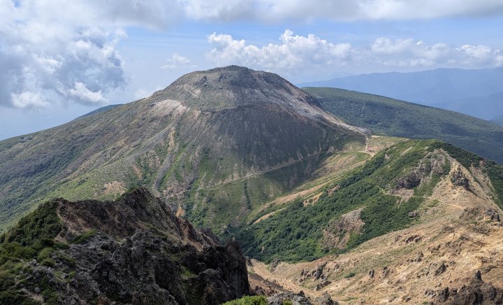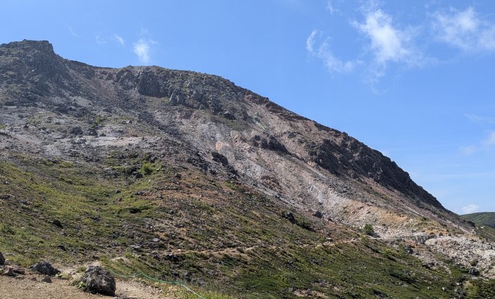 山頂駅からすぐに茶臼岳の頂が見え、そこから朝日岳へと続く縦走コースは、荒々しい岩場や黄色い硫黄が露出した山肌など、活火山ならではの迫力ある景観が広がっています。