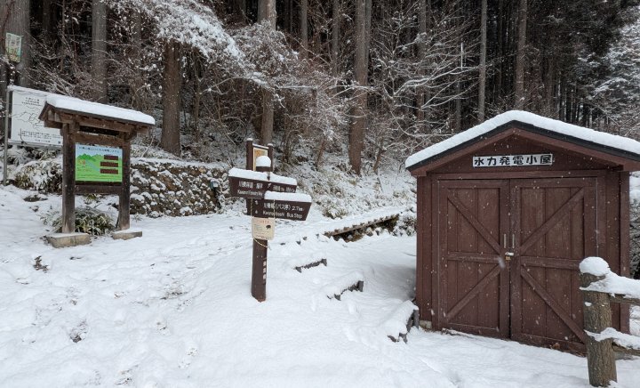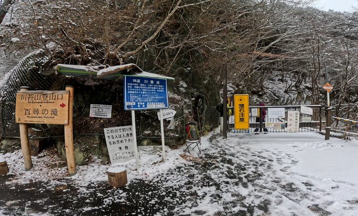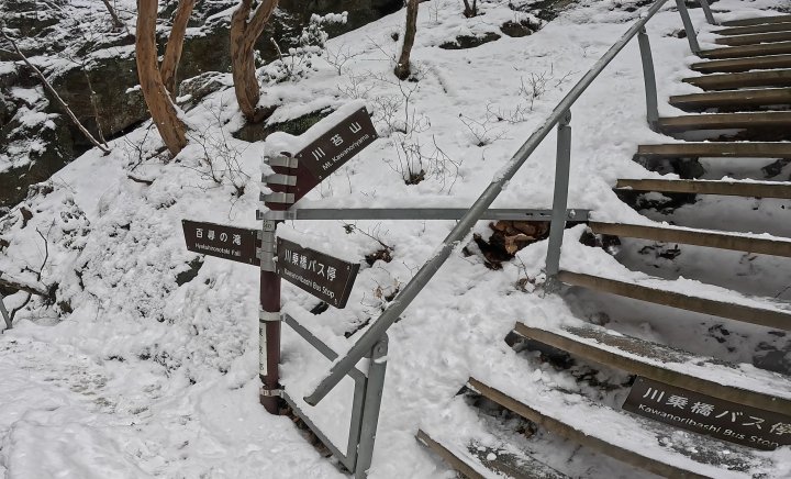 道中は渓谷沿いの岩場や橋がカチカチに凍結しているところもあり、軽アイゼンやチェーンスパイクは絶対に欠かせません。