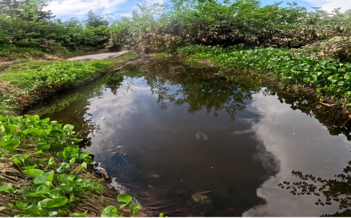 池には残雪があり、カエルもいました。