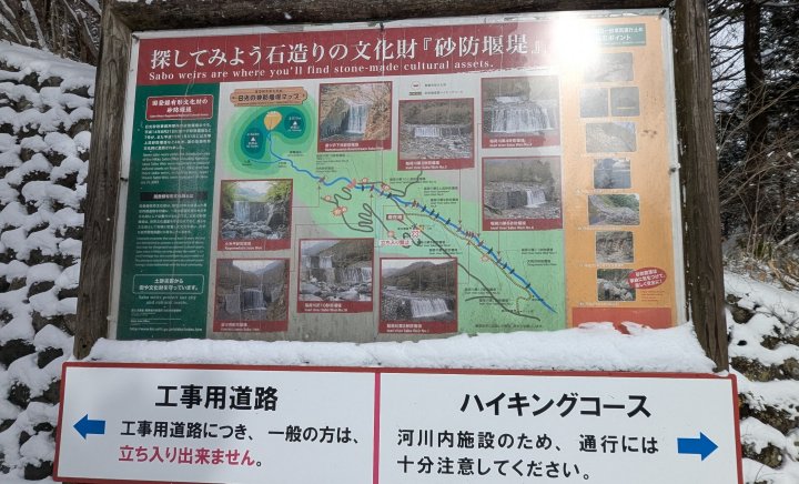 川沿いのハイキングコースを進みます。左のコースは閉鎖中のようです。