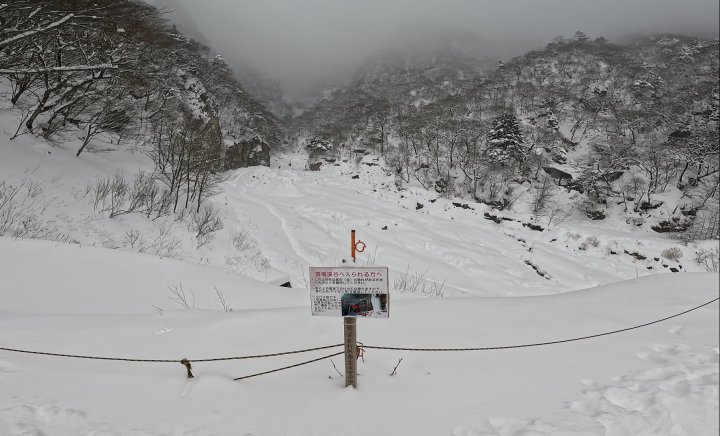 ココからやや雪も深くなるため、アイゼンが必要で、氷柱が落下する恐れがあるのでヘルメットも必要です。